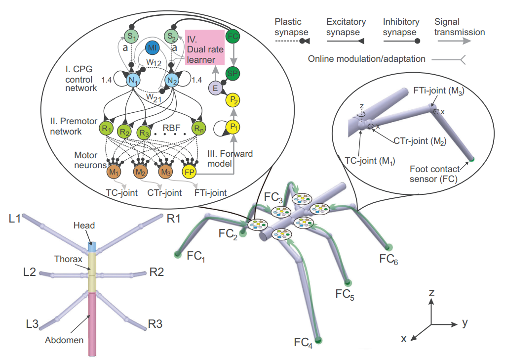 控制系统由四个子神经模块组成:1)基于神经中央模式发生器(central pattern generator,CPG)的控制,包括神经调节和脚接触反馈,用于生成和适应基本周期模式;2)一个预运动神经网络,用于塑造CPG周期性模式以获得类似于竹节虫的腿部运动(肢体内部协调);3)一个神经前向模型,用于预测脚接触反馈;4)一个双速率学习机制,用于不断适应脚接触反馈强度(称为在线感官反馈适应)。