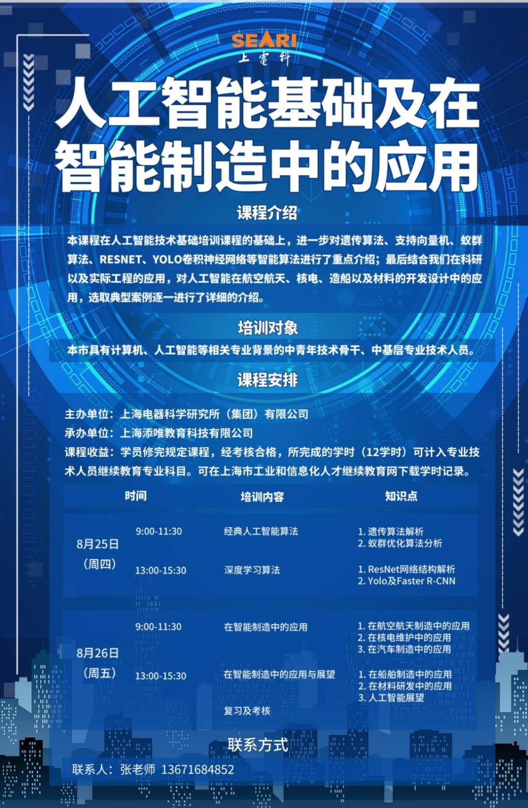 2022年8月25日-8月26日,上海电器科学研究所(集团)有限公司举办的《人工智能基础及在智能制造中的应用》(第一期)专业课顺利开班。